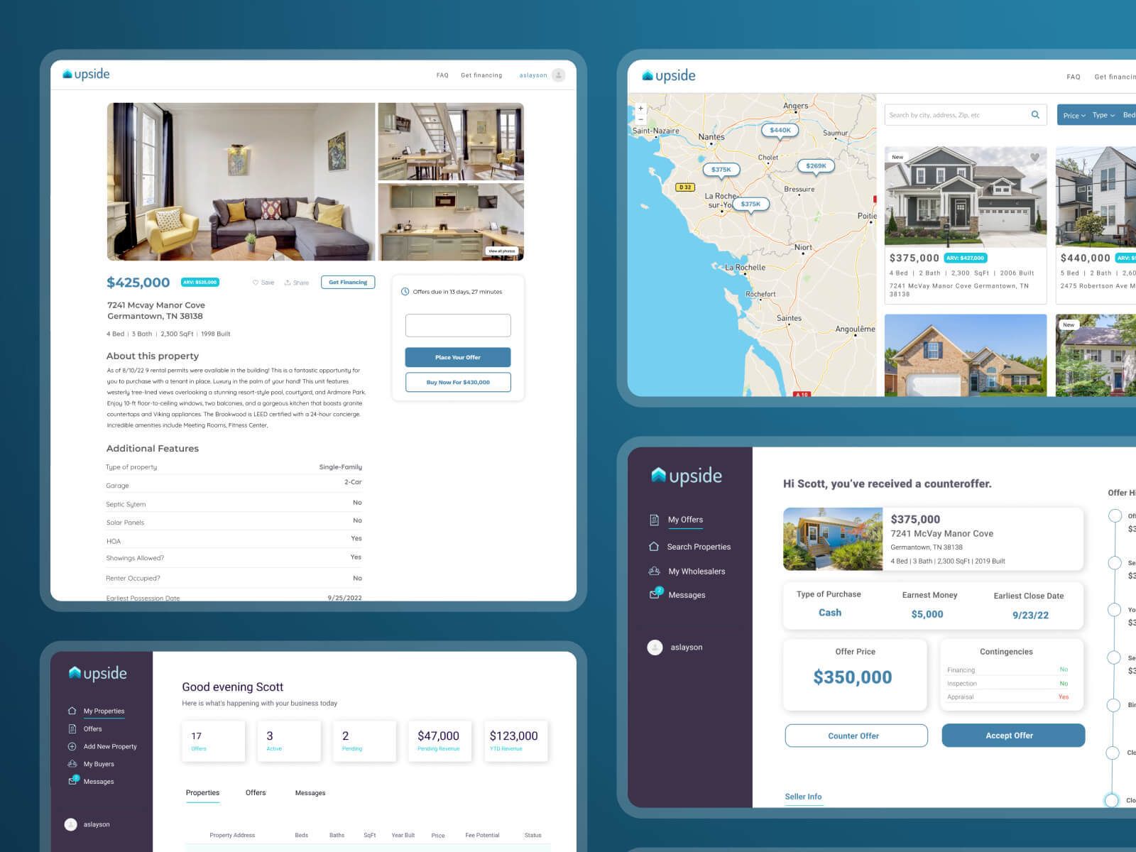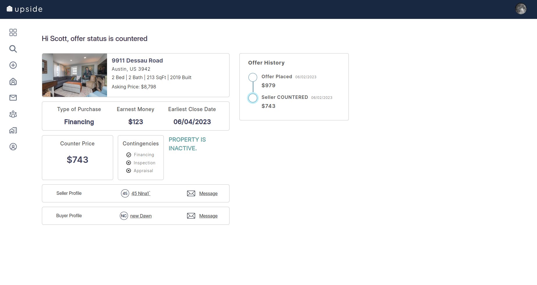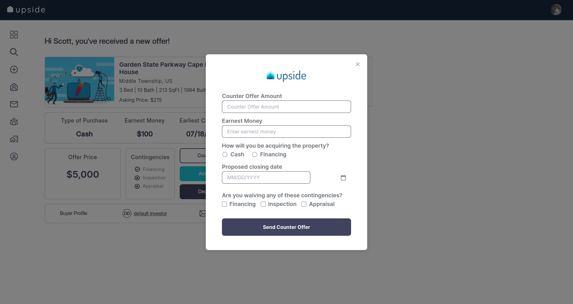Upside is a service-providing platform for sellers, buyers, and brokers. Here, sellers can add their property for selling or renting and buyers can buy the property from a list of options. It is a platform where sellers can counteroffer on the buyer's offer and finally, they can close the deal online.